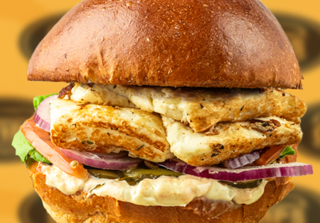 Klasyczna pozycja dla każdego kto nie je mięsa. Buła maślana, 200g grillowanego sera halloumi, ser cheddar, sałata, pomidor, czerwona cebula, ogórek kiszony, autorski sos burgerowy.
