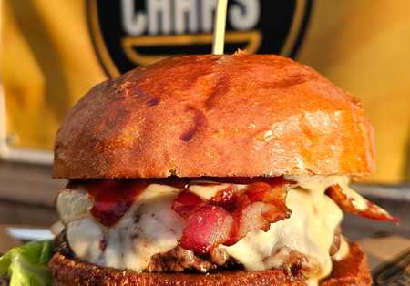 Ameryka w Chapsie - Chrupiący bekon, krążki cebulowe, ser cheddar, mięso 200g, roszponka, pomidor, czerwona cebula, sos majonezowy, sos BBQ, zamknięte w maślanej bułce.