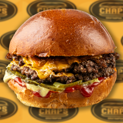 Bułka maślana prosto z piekarni, smashowana wołowina 2x 100g, ser cheddar, ogórek kiszony, keczup, musztarda