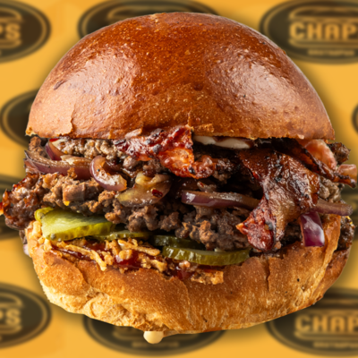 Podwójny chrupiący bekon, karmelizowana cebula,2x100g smashowanego mięsa wołowego, cebulka prażona, ogórek kiszony, sos bbg, majonez, całość zamknięta w maślanej bułce
