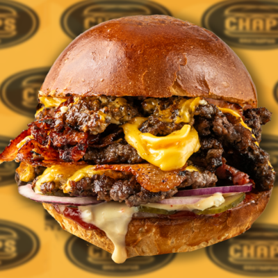 Burger na większy głód - Zaczynamy od bułki maślanej, a w niej-4x 100g smashowanego wołowego mięsa, podwójny cheddar, podwójny bekon, czerwona cebula, ogórek kiszony, sos bbq, majonez