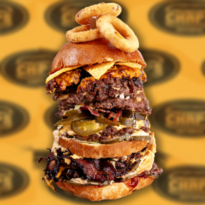 CO NAJMNIEJ 800G SMASHOWANEJ WOŁOWINY! A RESZTA? RESZTA JEST MILCZENIEM! A tak na poważnie, jest to pozycja dla prawdziwych Chapsożerców, dużo mięsa, dużo bekonu, dużo sera, dużo dodatków
